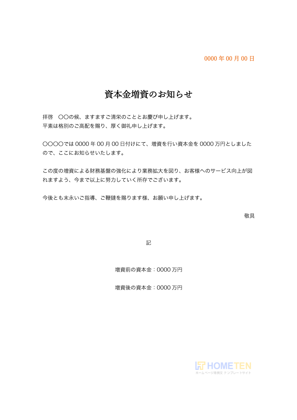 資本金増資のお知らせ ひな型版です。
