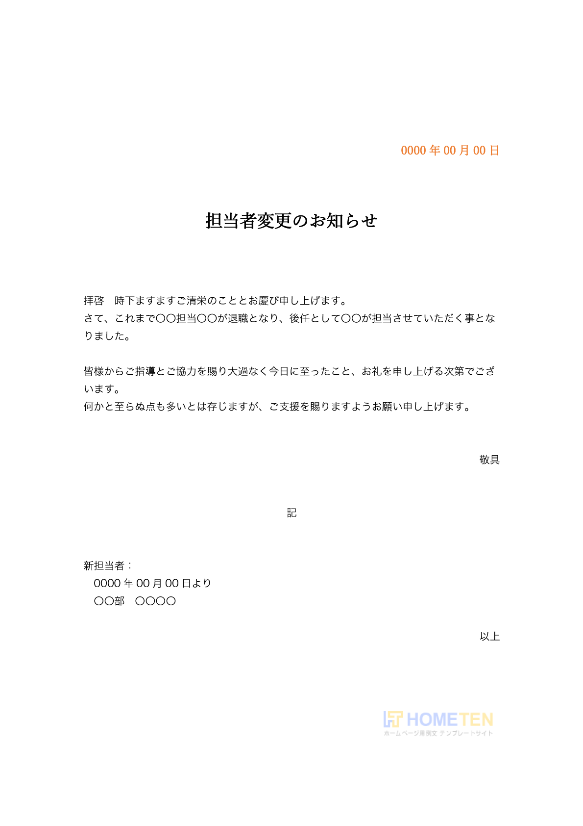 必要事項はすべて記載しておりますので担当者変更のお知らせのひな形としてご使用ください。