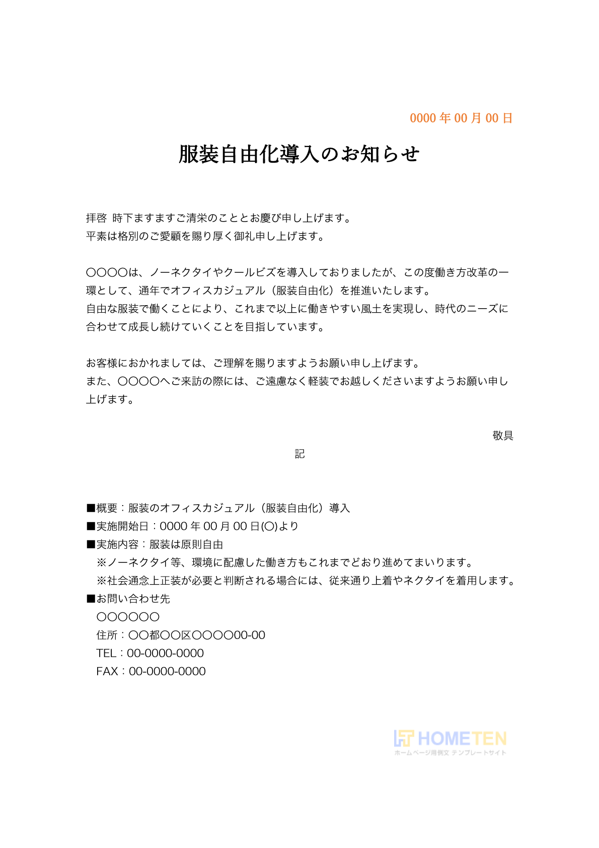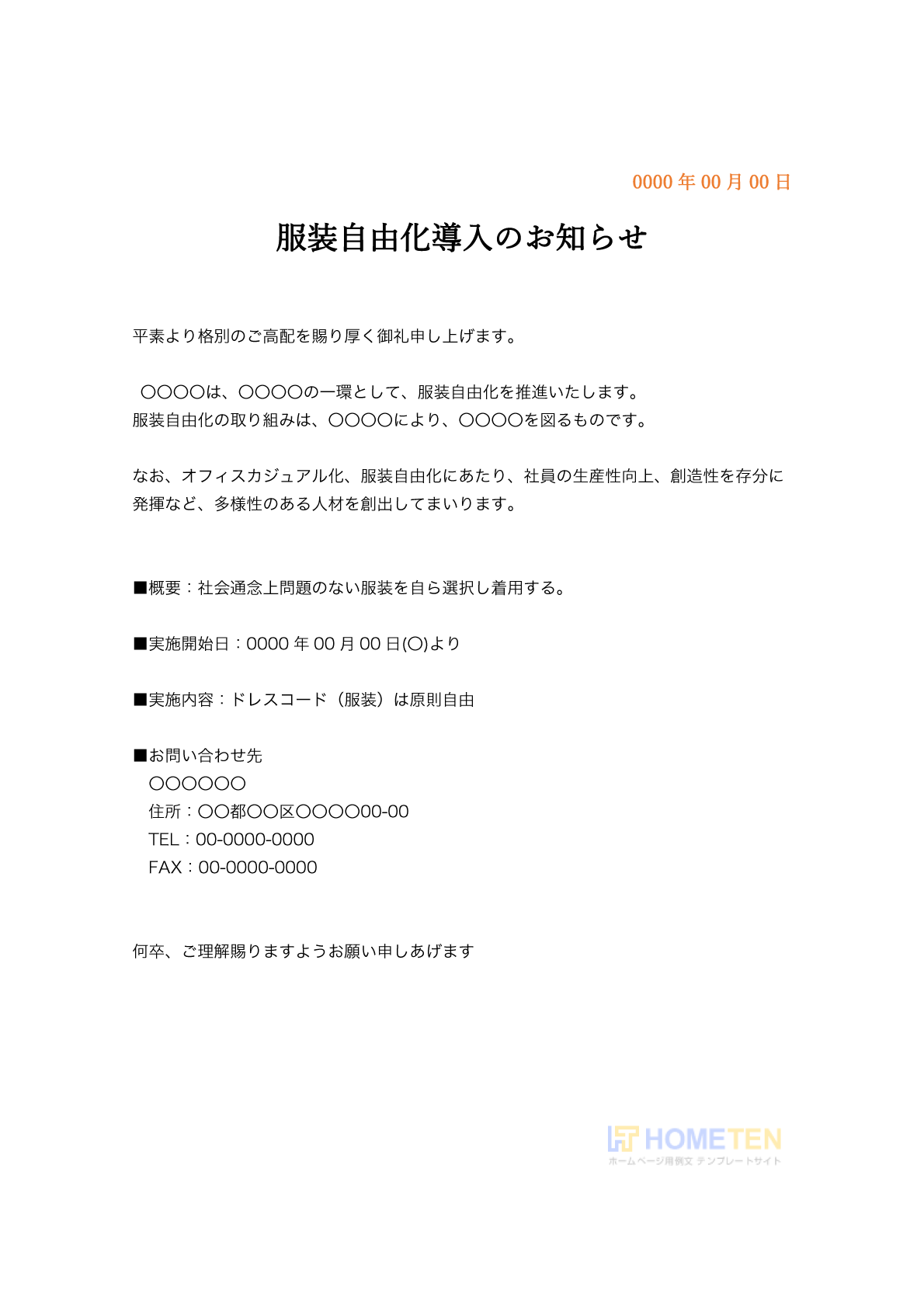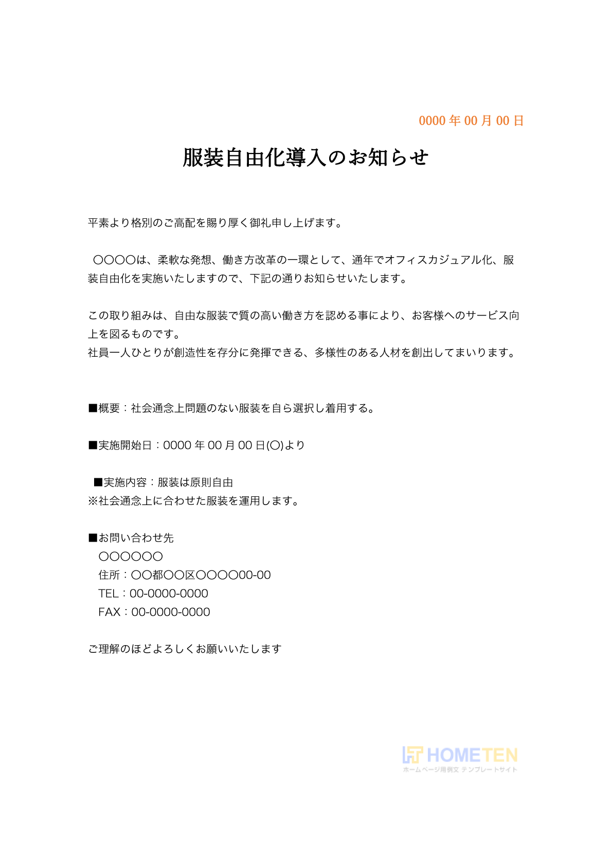 〇〇〇〇は、0000年00月00日(〇)より、従業員の服装の自由化を推進することをお知らせいたします。