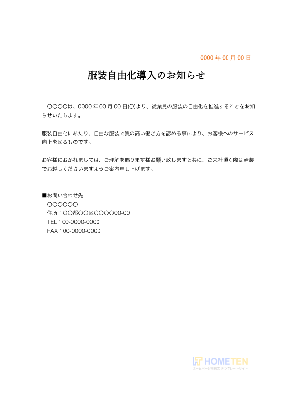改変しやすい、服装自由化導入のお知らせのひな型用例文です。