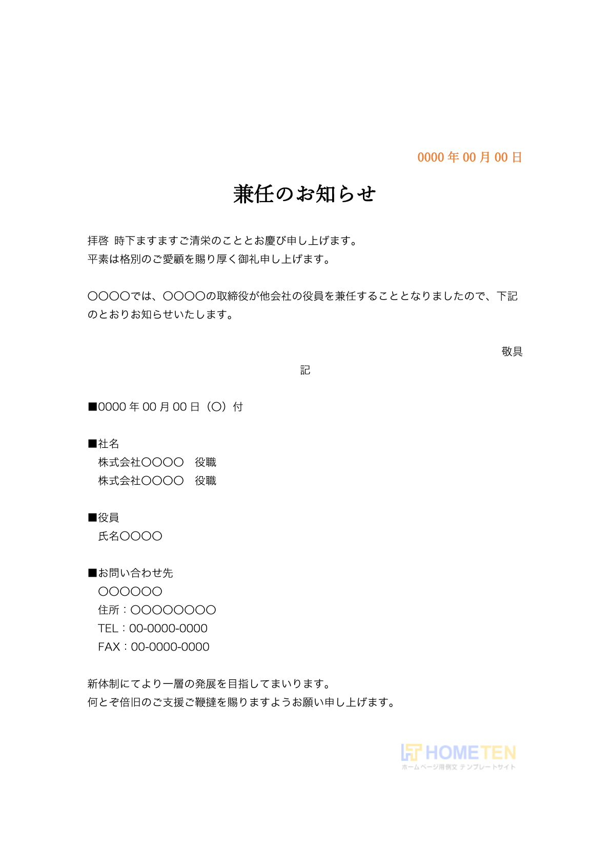 「詳細版」「標準版」「ひな型版」「短文版」の兼任のお知らせ例文をご用意いたしました。