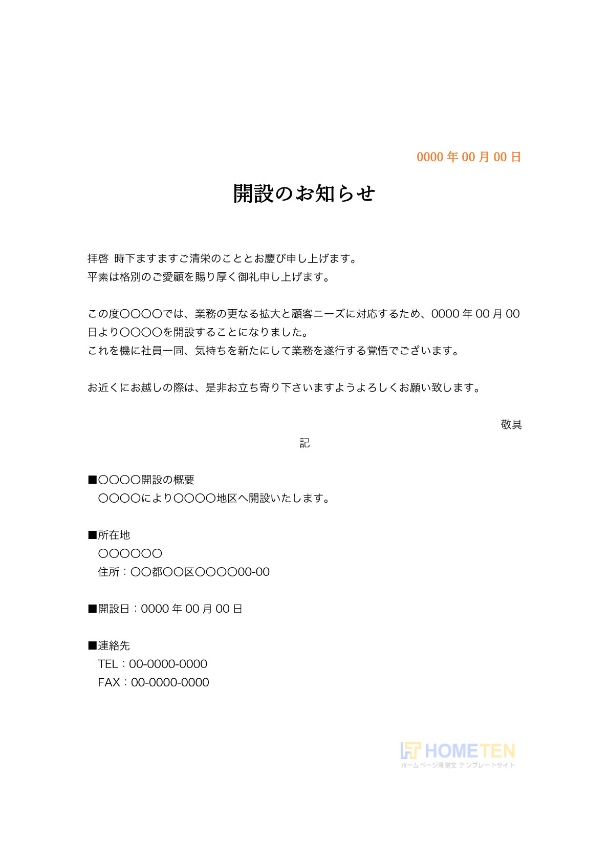 開設のお知らせを改変しやすい、ひな型として使用できる例文です。