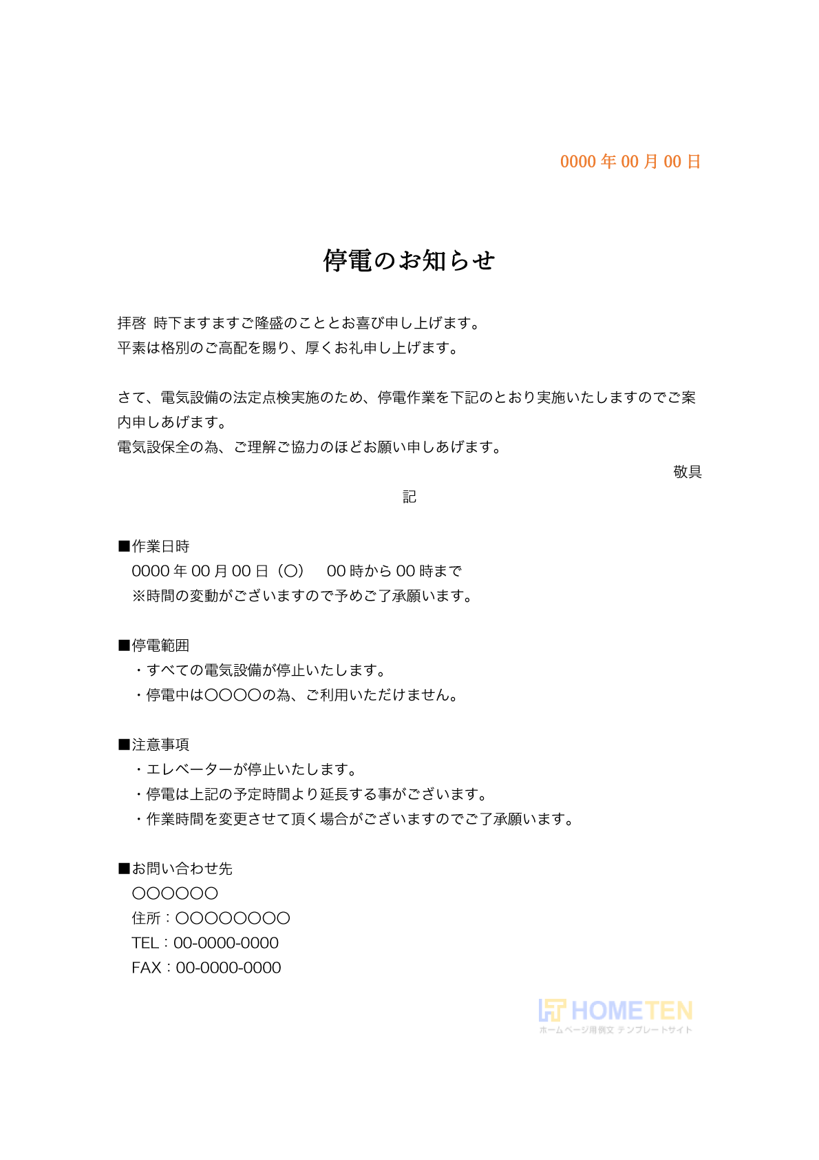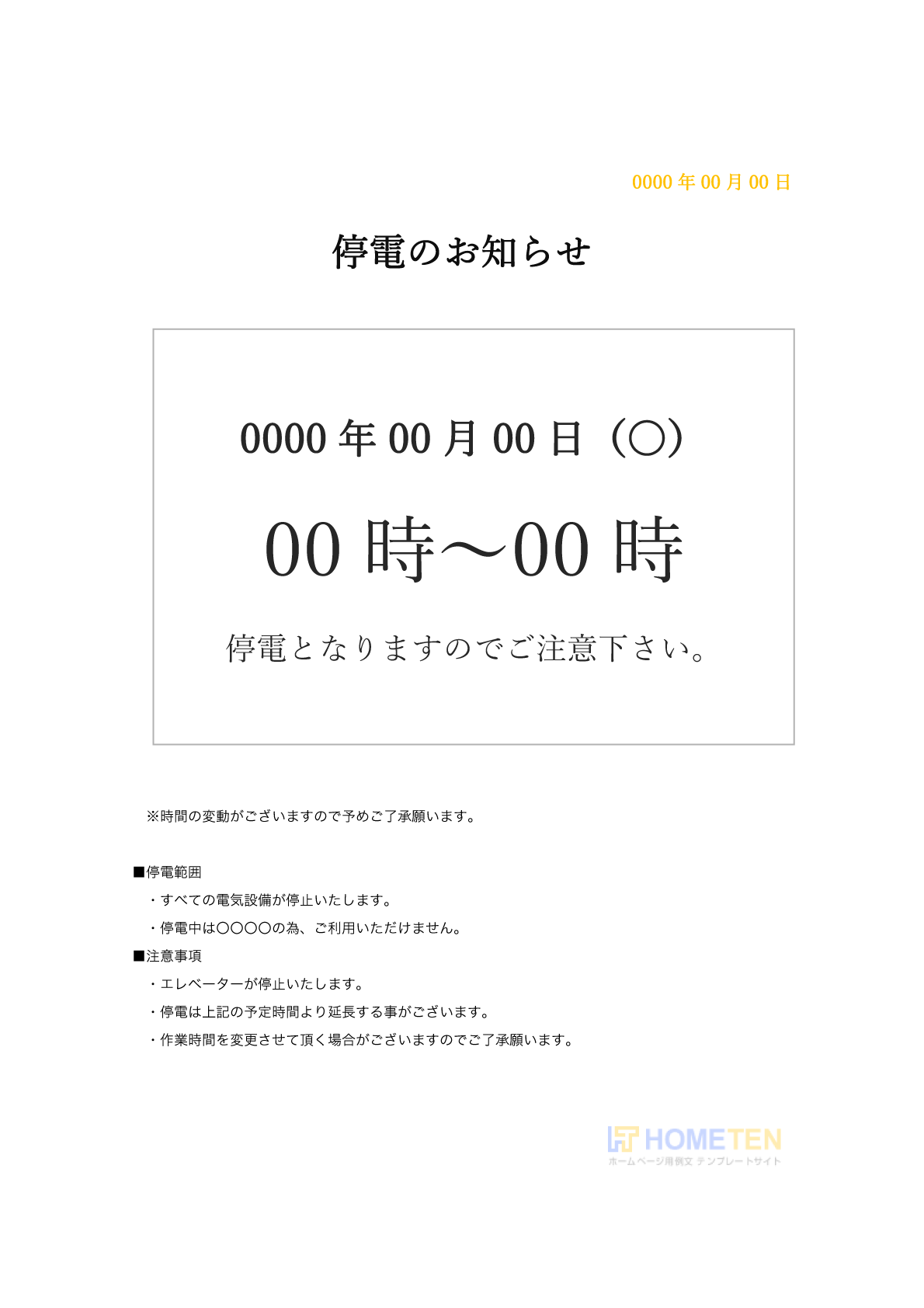 標準的な停電のお知らせ例文です。日付と時間、注意事項を変更後ご使用下さい。
