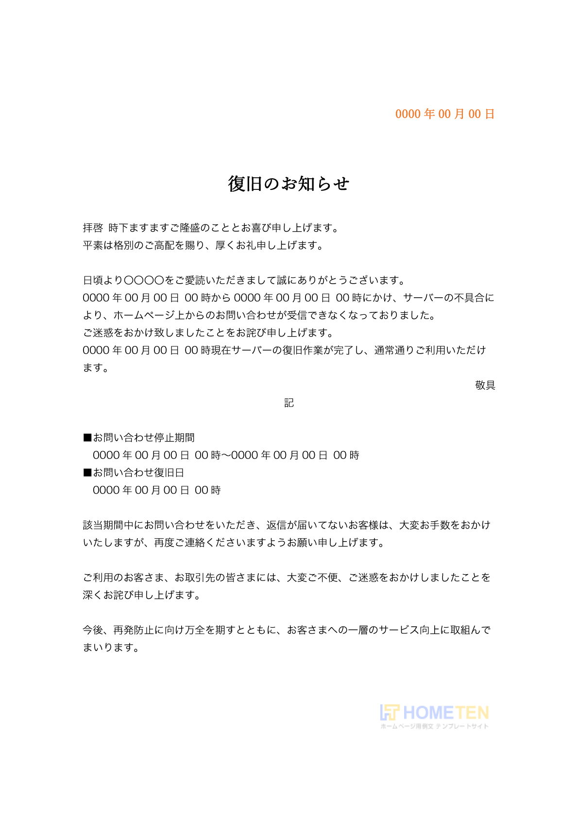 標準的な復旧のお知らせ例文です。日付と時間を変更後ご使用下さい。