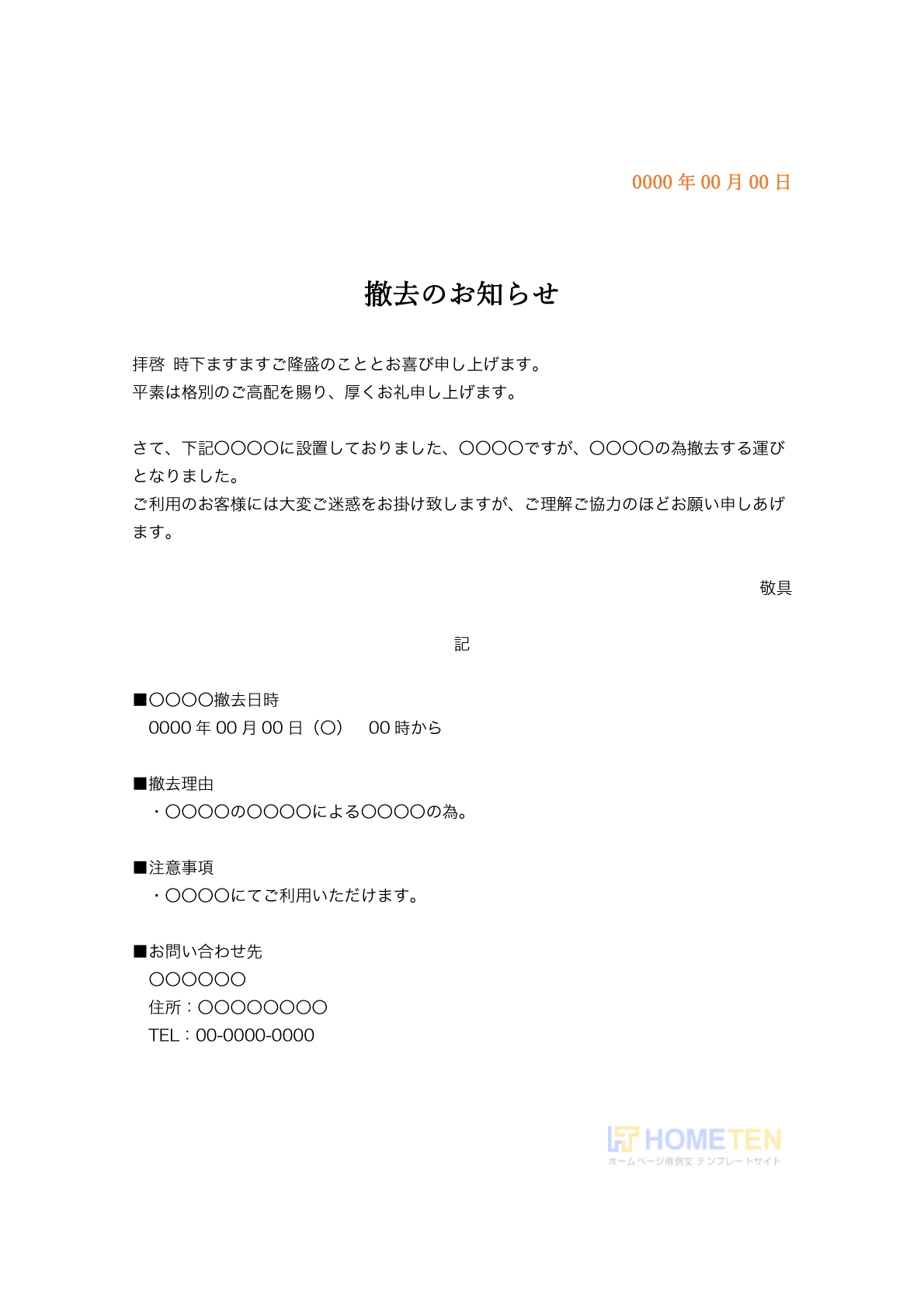 撤去のお知らせ 例文