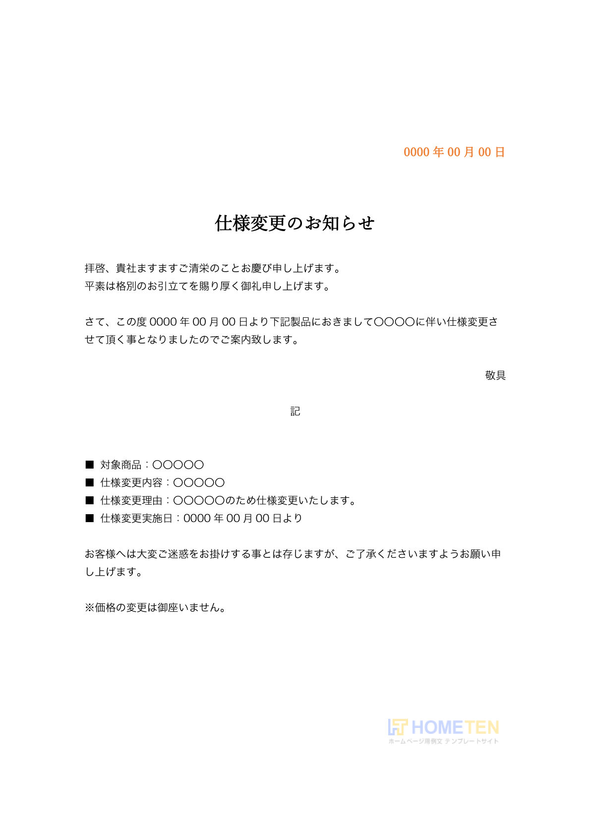 標準的な仕様変更のお知らせ例文です。仕様変更内容や対象商品は変更後ご使用下さい。