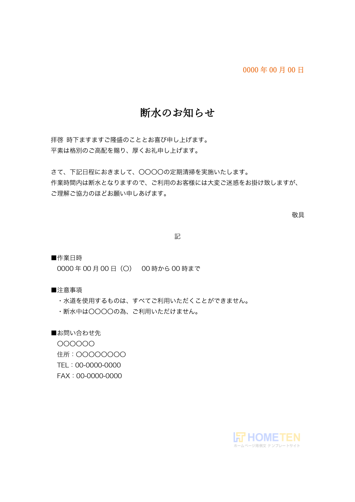 断水の連絡、予告として日程の報告ができる例文です。断水理由を変更してご使用下さい。