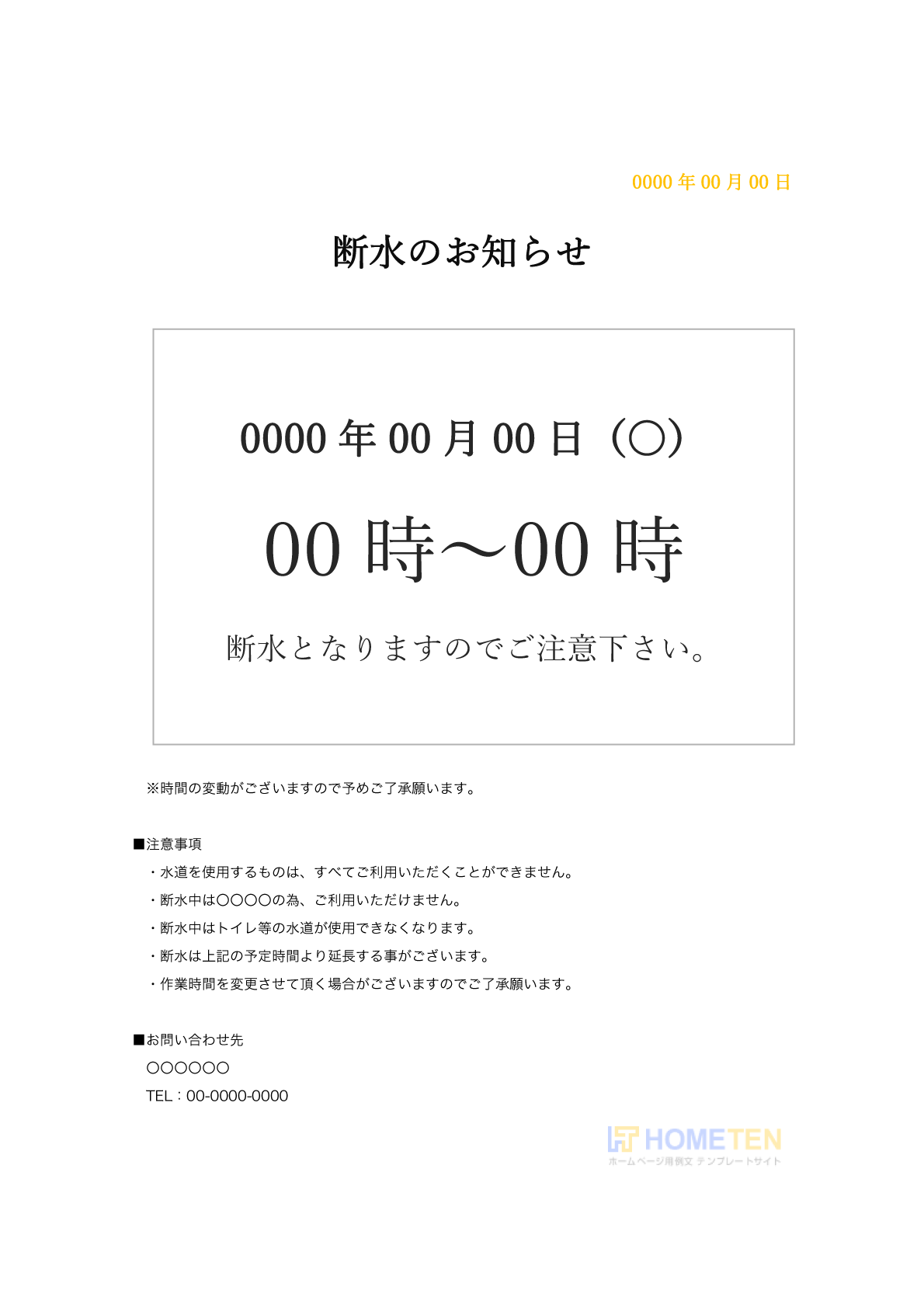 断水の予告、告知ですので断水の日程や時間、断水中に関する注意事項は必ず記載した方がよいと考えます。