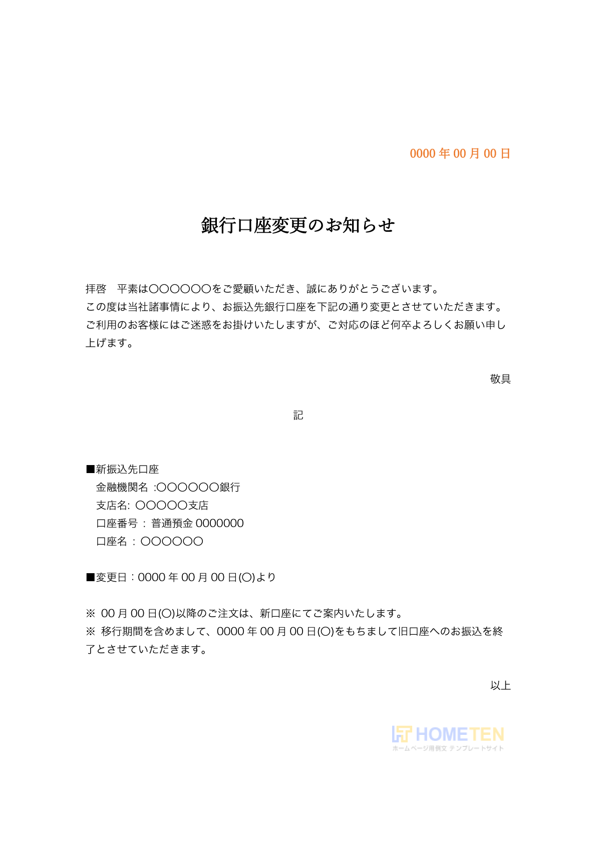 ● 例文3(雛形)銀行口座変更のお知らせ