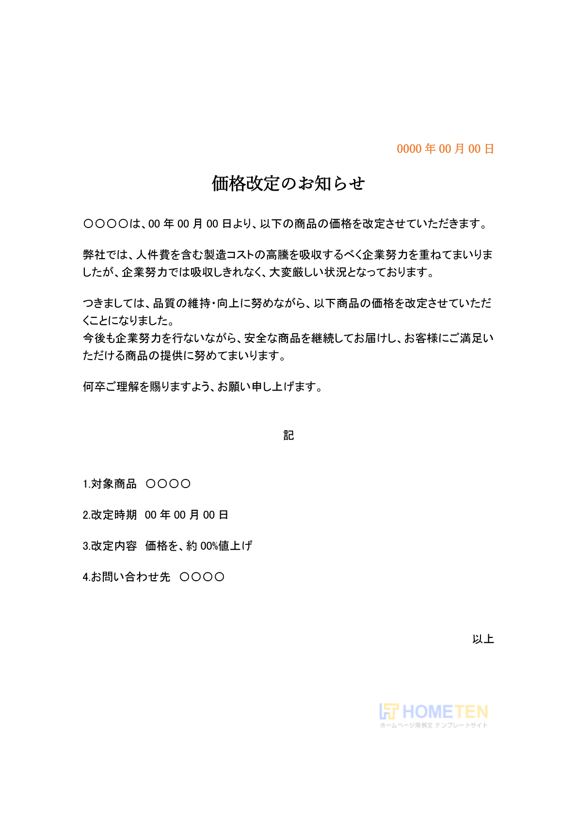 価格改定のお知らせ 企業用の値上げのお知らせ例文です。