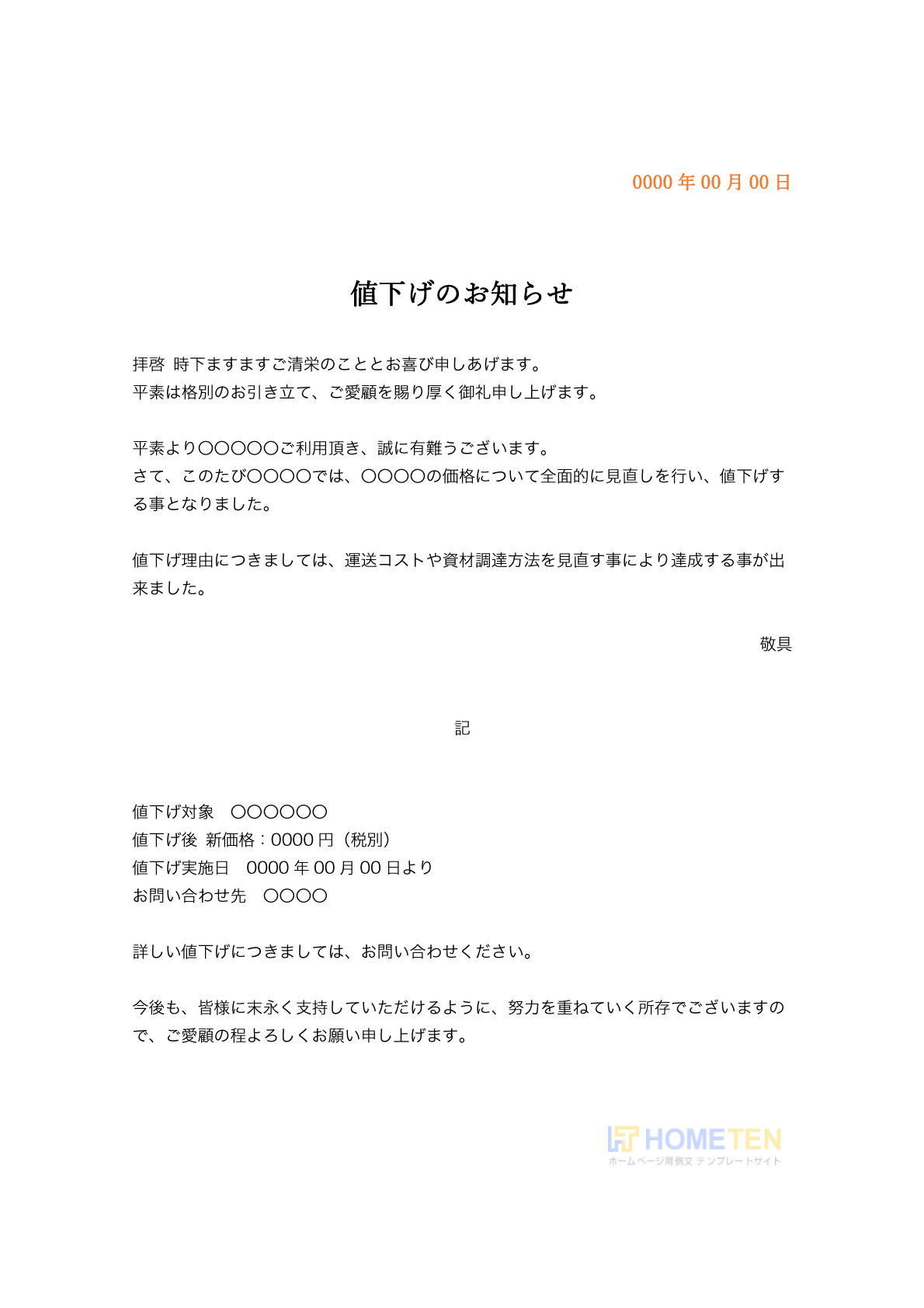 価格の値下げについて必要事項を掲載。詳細を書き換えてご使用下さい。