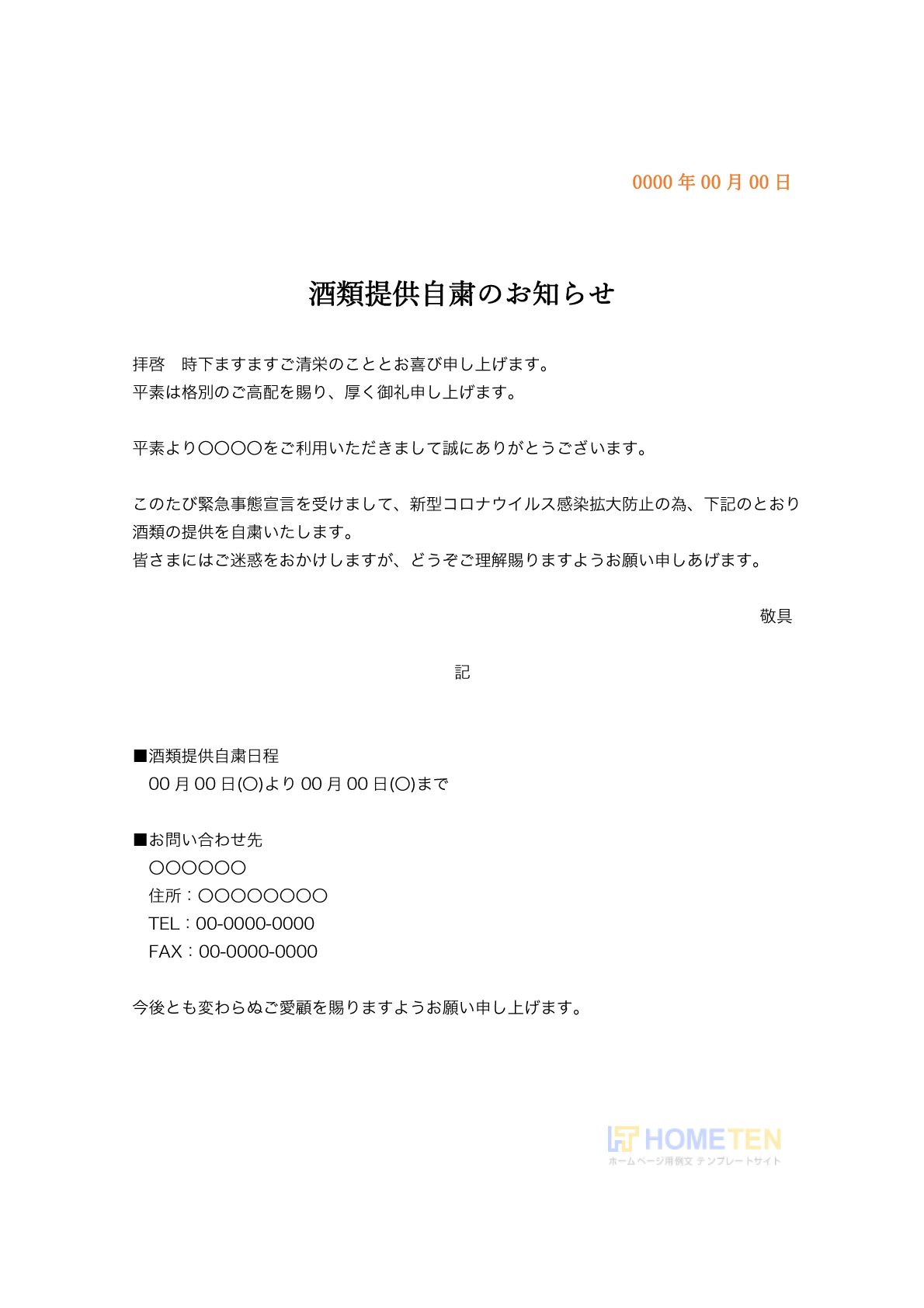 酒類提供自粛をテンプレートとして使いやすいひな型用例文です。