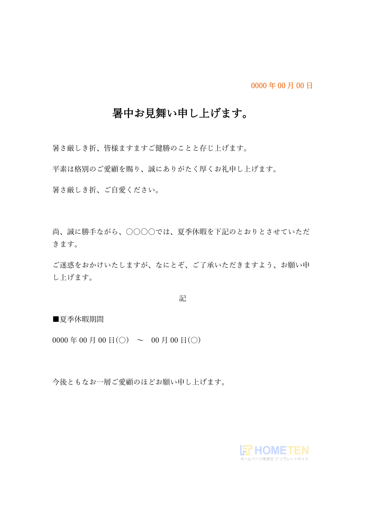 暑中お見舞いのご挨拶と同時に夏季休業期間も掲載する例文です。
