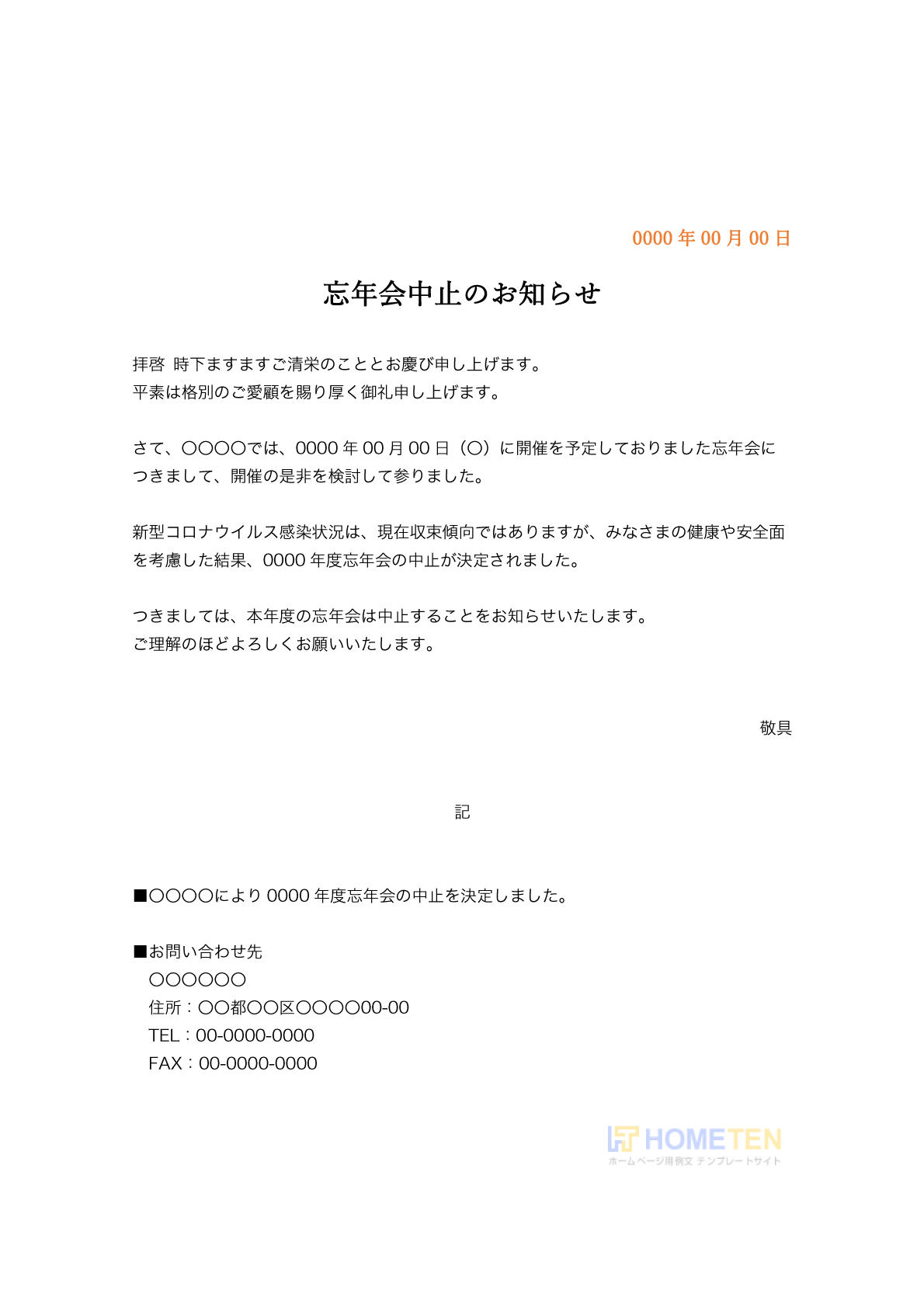 〇〇〇〇は,0000年00月00日に予定しておりました、0000年度忘年会は中止とさせて頂きます。